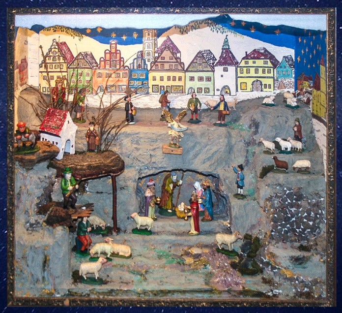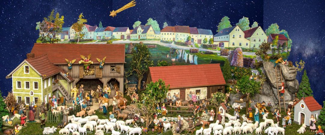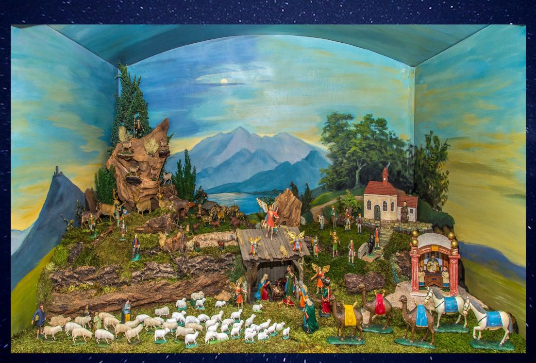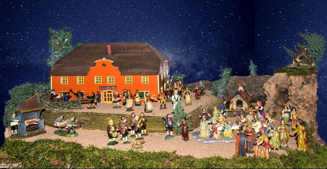 Eine Krippe aus dem 19. Jahrhundert mit vielen typischen Tirschenreuther Figuren. Diese stammen aber wahrscheinlich aus den beiden Krippen der Familien Beer und Schirmer.