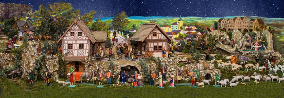 Die Figuren selbst sind in der Hauptsache so genannte „Grulicher Figuren“. Diese wurden von seinem Vater gekauft und zum größten Teil von seiner Mutter bei der Vertreibung 1946 mitgenommen. Die Figuren erhielten dann 2008 eine weitere Ergänzung. Eine Rarität ist dabei, der Hirte (rechts), inmitten seiner Herde, der sein Lamm auf eigenartige Weise trägt, dem Lamm sind die Läufe zusammengebunden. Die Häuserzeile hinten rechts ist ein Teil des Marktplatzes in Reichenberg, dem heutigen Liberec. Das Hintergrundbild hat Erich Werner (1939-2016) gemalt.