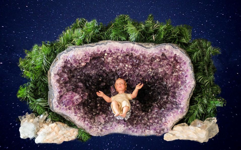Eine Krippe der etwas anderen Art hat Felix Eckert 2018 geschaffen. Als Bergbauingenieur hat er das Jesuskind in eine Amethyst Druse gelegt. Die Figur stammt von dem Pilsener Schnitzer Jaruslav Sekyra.
