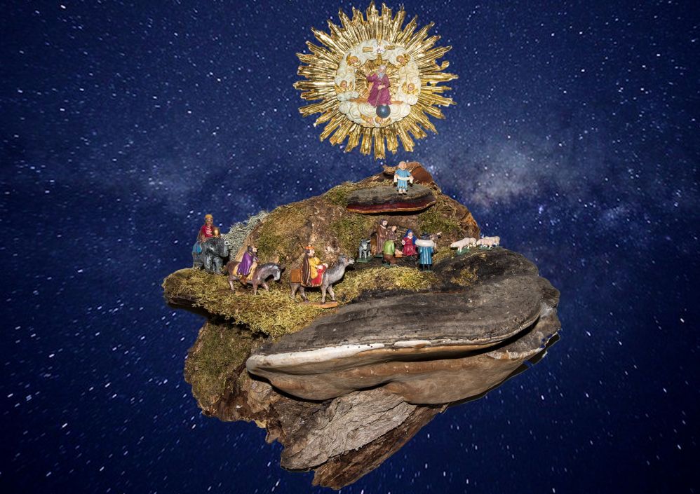 Auf dem Heimweg von der Jagd entdeckte Leonhard Kühn diesen einmaligen Baumschwamm. Sofort kam ihm die Idee, eine Krippenlandschaft daraus zu fertigen. Das tat er dann auch. Die Figuren dazu schnitze Robert Schneider aus Tirschenreuth. Der Strahlenkranz stammt von dem kürzlich verstorbenen Pilsener Schnitzer Jaroslav Sekyra, der Herrgott darin von Jihann Mack (1946-2005).