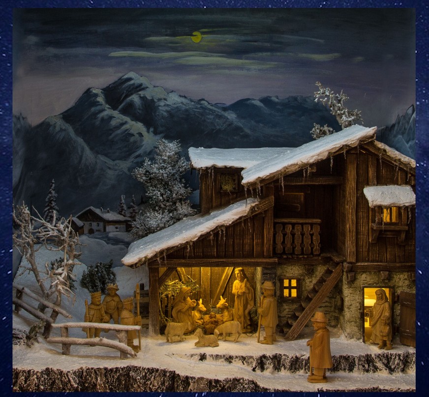 Das Elternhaus links, existiert so heute nicht mehr, so hat es in seiner Kindheit ausgesehen. In der Scheune findet die Geburt statt. Darum herum Hirten und Bauersleute aus Hohenwald, und in der Mitte weist der Sterndeuter zum Kindlstern hoch über den Dächern. Daneben das 200 Jahre alte Hirthaus. Rechts der Wolfenstein, ein sagenumwobener Findling in unmittelbarer Nähe des Dorfes. Eine Leiter vereinfacht das Besteigen des Felsens, denn das Benutzen der eingeschlagenen Kerben erfordert schon Geschick und etwas Mut. Einer Sage nach öffnet sich am Palmsonntag, während der Hl. Messe unter dem Felsmassiv eine Schatzkammer, gefüllt mit Gold und Silber. Davor die Henrichn-Kapelle mit ihrem roten Dach. Vor ihr eine betende Familie. Daneben die Tochter Madeline mit ihrem Akkordeon.