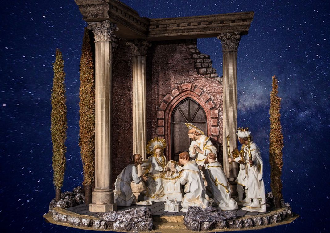 Unsere Krippe besteht aus Teilen der Anbetung der Hirten und der Anbetung der Könige. Die Tempelruine dazu baute Günter Stammwitz aus Tirschenreuth.