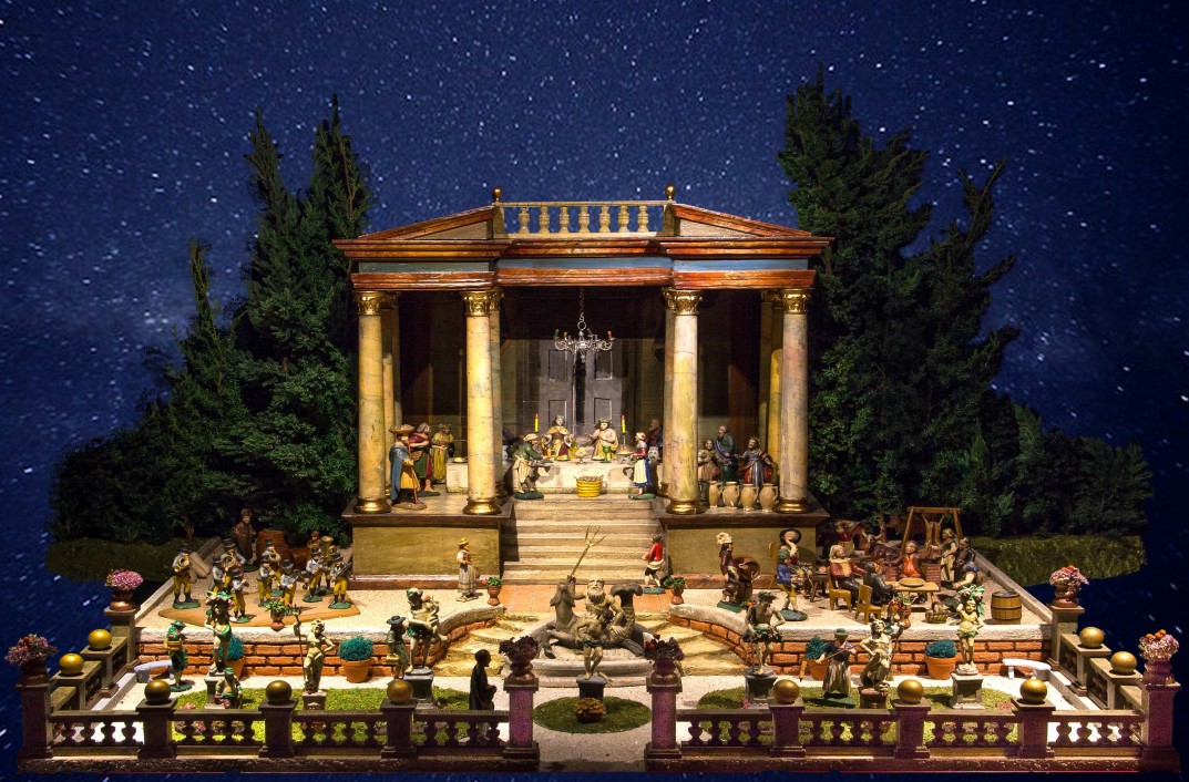 Der Palast und die Figuren aus der zweiten Hälfte des 19. Jahrhunderts, könnten von den Brüdern Josef Hautmann (1813-1891) und Sigmund Stock (1822-1899) stammen. Auffallend ist, dass der Palast eine große Ähnlichkeit mit dem Tempel der Schricker-Krippe aufweist. Das Besondere in der Schricker-Krippe ist ja, dass aus dem Tempel, durch eine wechselbare Rückwand, ein Palais wird.